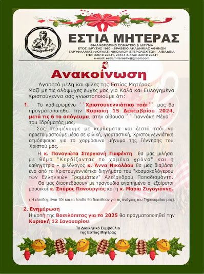 Το ίδρυμα της Εστίας Μητέρας Λιβαδειάς καλεί στο καθιερωμένο Χριστουγεννιάτικο τσάι του την Κυριακή 15 Δεκεμβρίου, μετά τις 6 το απόγευμα.