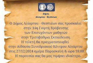 Γιορτή βράβευσης των πρωτοετών φοιτητών διοργανώνει, για 14η χρονιά, ο Δήμος Αλιάρτου-Θεσπιέων, την Παρασκευή 27 Δεκεμβρίου, ώρα 18:00, στο Συνεδριακό Κέντρο Αλιάρτου.