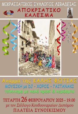 Στο πλαίσιο των αποκριάτικων εκδηλώσεων “Γαϊτανάκι 2025” του Δήμου Λεβαδέων, το έθιμο της “καλής φωτιάς” αναβιώνει την Τετάρτη το απόγευμα, στην πλατεία του Συνοικισμού στη Λιβαδειά, από το Μικρασιατικό Σύλλογο της πόλης.