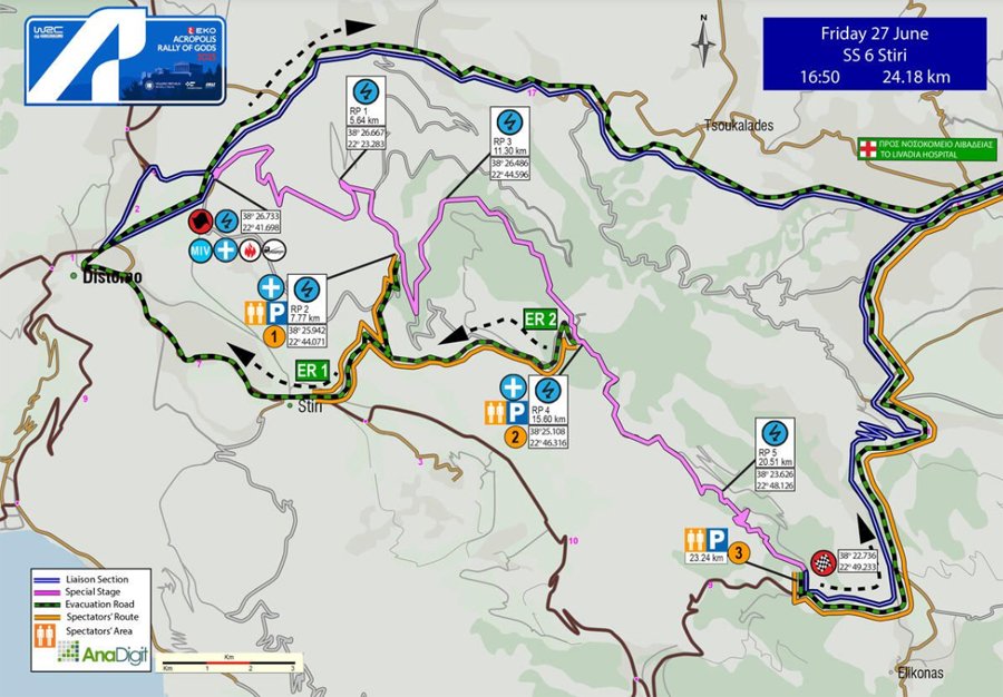Σύμφωνα με τις οδηγίες για όσους ενδιαφέρονται από τη Λιβαδειά να πάνε προς την περιοχή της ειδικής διαδρομής: «Κινούμενοι από τη Λιβαδειά προς το Κυριάκι, φτάνετε στη διασταύρωση για Ελικώνα, όπου μηδενίζετε τον χιλιομετρητή. Μετά από 2,3 χιλιόμετρα, προσπερνάτε στα δεξιά το STOP της ειδικής διαδρομής. Έπειτα από 740 μέτρα, σε αριστερή στροφή με αρχή μπαριέρας και ανάποδη πινακίδα STOP, στρίβετε δεξιά σε ανηφορικό χωματόδρομο. Μετά από 500 μέτρα φτάνετε στο 23,24 χιλιόμετρο της ειδικής διαδρομής».