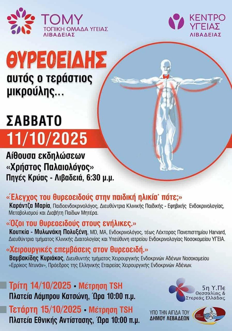 Η ΤΟΜΥ Λιβαδειάς, με τη στήριξη του Δήμου Λεβαδέων, σας προσκαλεί σε μια ενημερωτική εκδήλωση αφιερωμένη στον θυρεοειδή αδένα το Σάββατο 11/10 στις 18:30 στο Συνεδριακό «Χρήστος Παλαιολόγος».