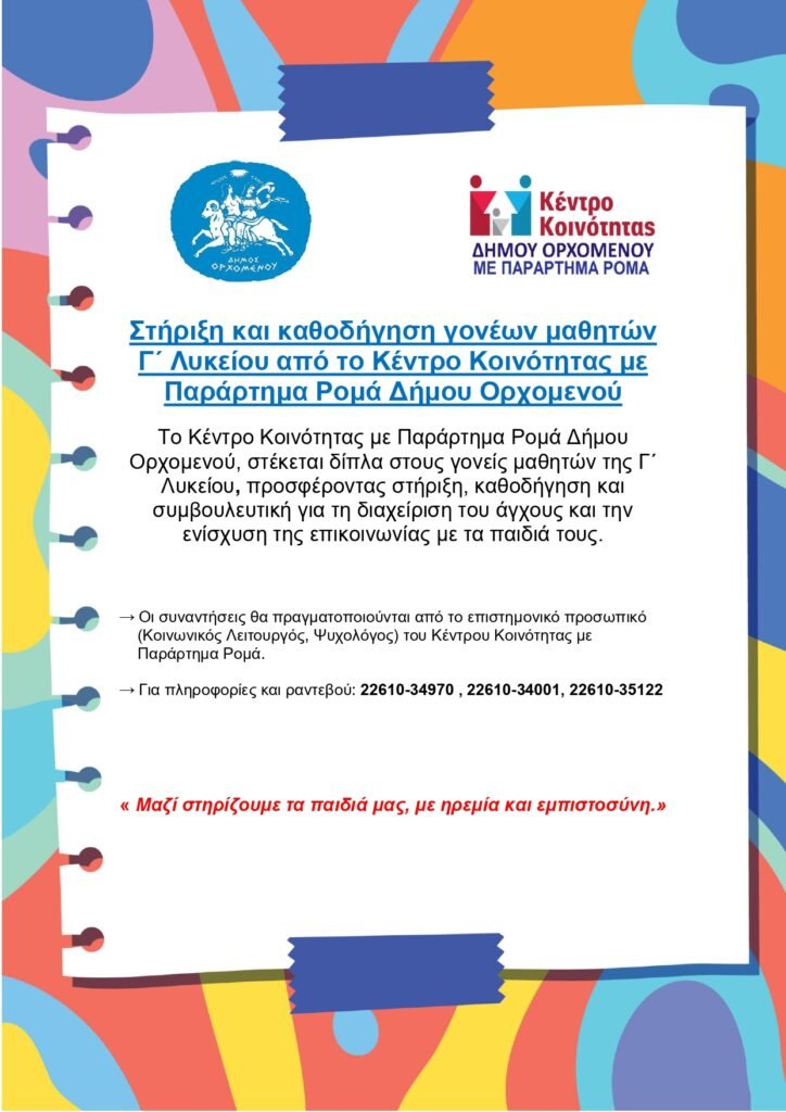Το Κέντρο Κοινότητας με Παράρτημα Ρομά Δήμου Ορχομενού, στέκεται δίπλα στους γονείς μαθητών της Γ΄ Λυκείου, προσφέροντας στήριξη, καθοδήγηση και συμβουλευτική για τη διαχείριση του άγχους και την ενίσχυση της επικοινωνίας με τα παιδιά τους.