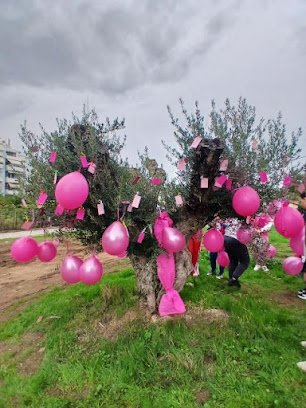 Στο τέλος του πάρκου Χρυσορρόα ένα δέντρο ελιάς στολίστηκε με τα ροζ μας μπαλόνια και καρτούλες με τα αρχικά των γυναικών ,που ο καθένας μας γνώριζε, οι οποίες στέφθηκαν νικήτριες στη μάχη ενάντια στον καρκίνο .