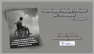 Η 3η Δεκεμβρίου, Παγκόσμια Ημέρα για τα Άτομα με Αναπηρία, αναδεικνύει τις ανισότητες που εξακολουθούν να βιώνουν οι ανάπηροι συμπολίτες μας.