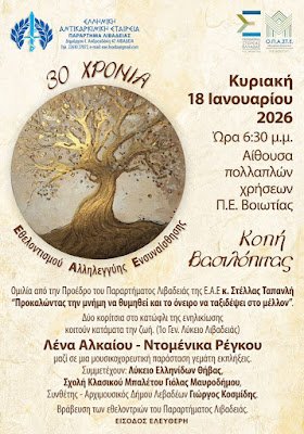 Η εκδήλωση θα πραγματοποιηθεί την Κυριακή 18 Ιανουαρίου, στις 6:30 το απόγευμα, στην αίθουσα πολλαπλών χρήσεων του Διοικητηρίου της Π.. Βοιωτίας.