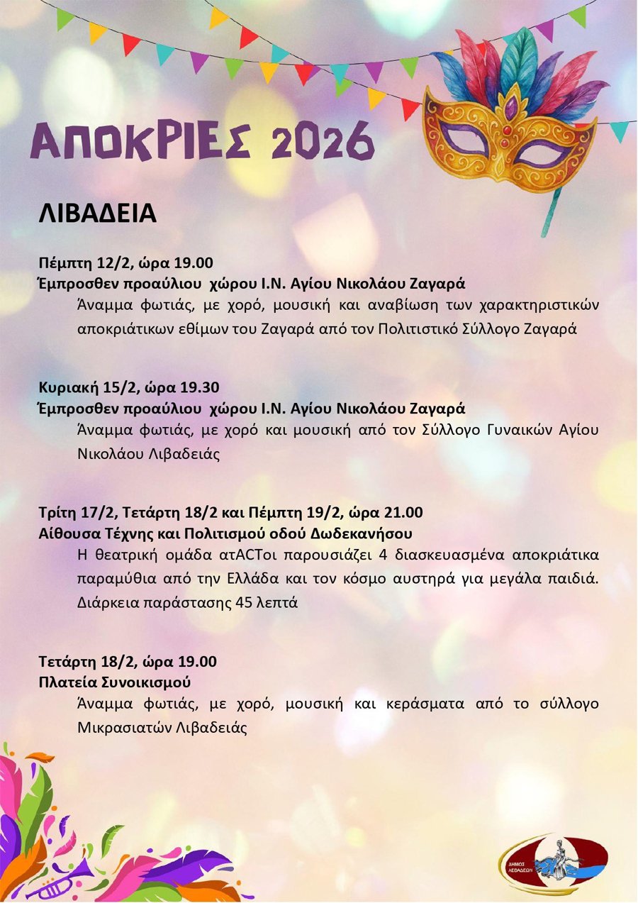 Ο Δήμος Λεβαδέων ανακοινώνει το πρόγραμμα των αποκριάτικων εκδηλώσεων! Ελάτε να γιορτάσουμε μαζί, να γελάσουμε, να χορέψουμε και να μοιραστούμε τη χαρά των Αποκριών με μικρούς και μεγάλους!