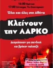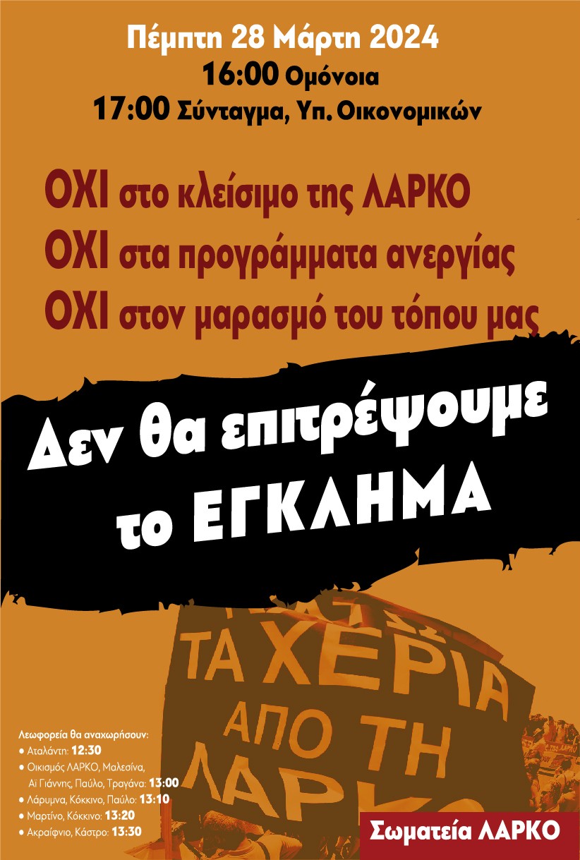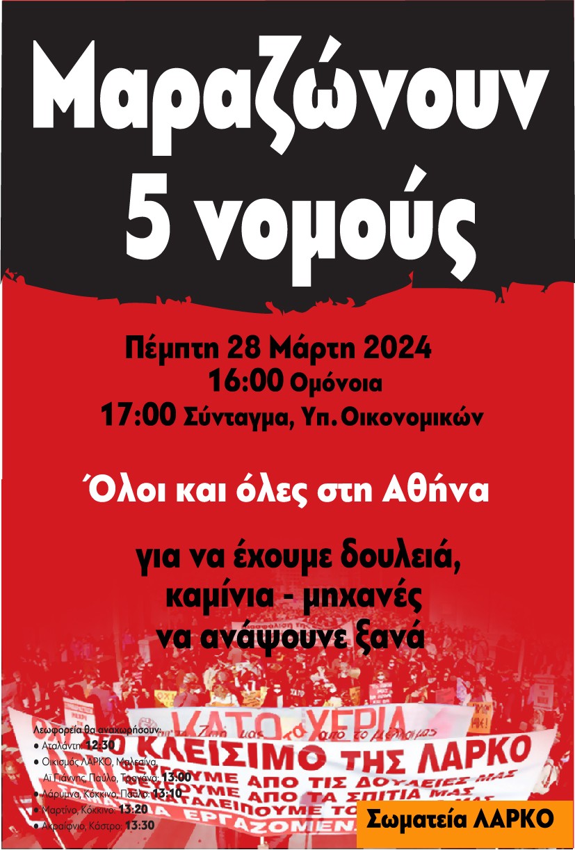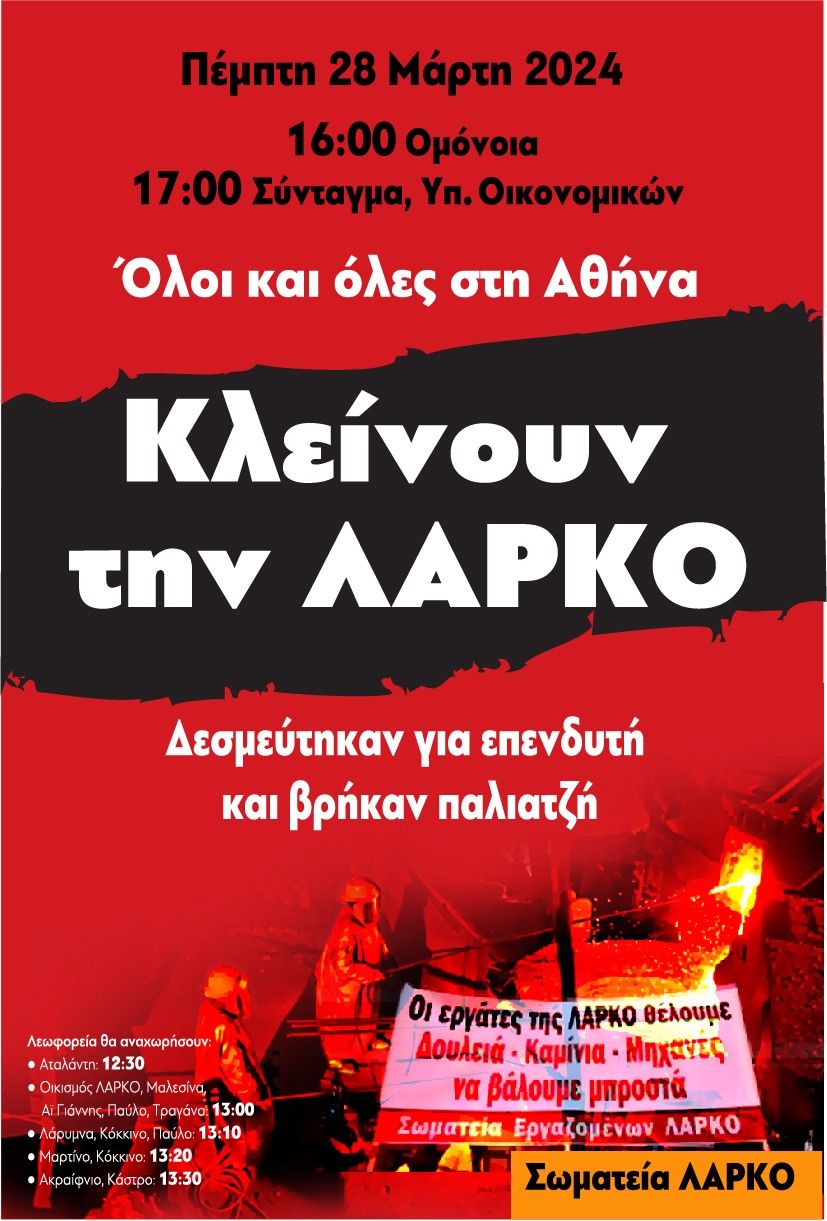 Τα σωματεία των εργαζομένων της ΛΑΡΚΟ απευθύνουν κάλεσμα προς όλους για την διαδήλωση που θα γίνει την Πέμπτη 28 Μαρτίου 2024 και ώρα 5:00 το απόγευμα στην Αθήνα:
